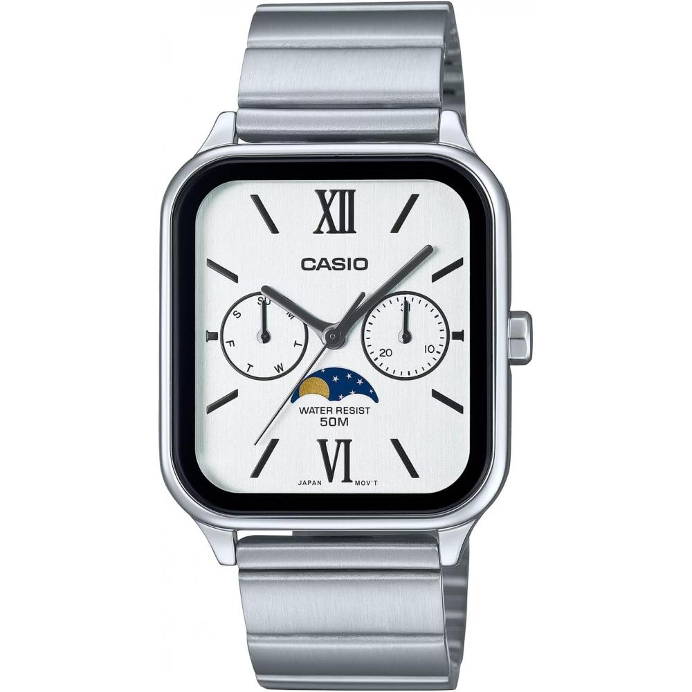 The CASIO Standard Moon Phase Analog Men's Watch MTP-M305D-7A2V combines modern design with practicality. Featuring analog three hands, it displays date, day, and moon phases. It boasts an impressive average monthly deviation of ±20 seconds. The watch has a battery life of three years and is characterized by an elegant metal band. It has a water resistance of 5 ATM, making it suitable for everyday use.