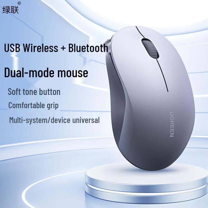 The UGREEN MK331 Silent Dual-Mode Wireless Mouse is designed for efficient office use with its quiet click buttons. It offers flexible connectivity via 2.4G wireless and Bluetooth, allowing simultaneous connection to two devices like laptops and desktops. This right-handed mouse comes with a shared USB receiver and operates on dry batteries for convenience.