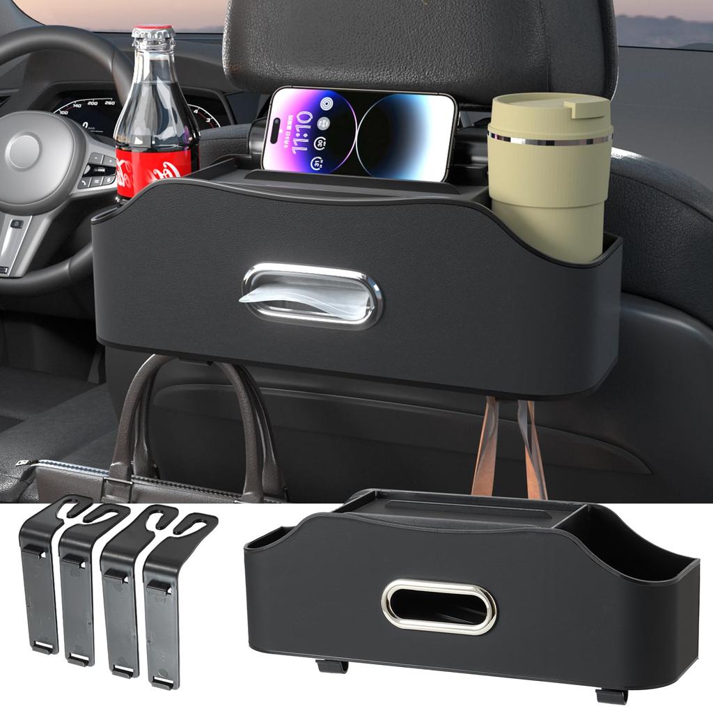 Sancaral Multifunctional Drink Holder for Rear Seats Tissue Box and Headrest Cup Holder Storage Car Interior Storage Item (with Hook), Box, (Black)