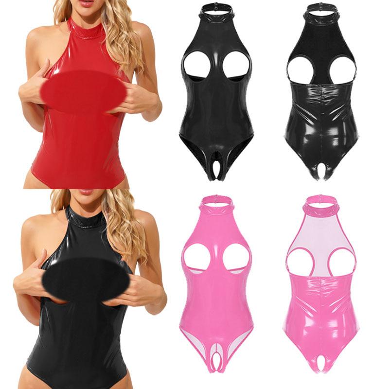 Plus Size Womens Sexy Cutout Patent Leather Bodysuit Halter Neck Backless Crotchless One Piece Sexy Costume