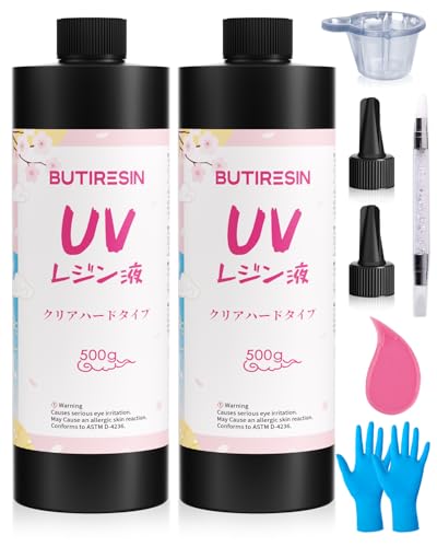 【BUTIRESIN UV Resin Kit】Large capacity & low price! 500g x 2 bottles of UV resin. High-quality type with high transparency, fast curing, and yellowing resistance, ideal for accessory making and DIY. The nozzle cap allows for precise control of the liquid volume. The gloves provide excellent hand protection, and the opener allows for easy opening. A silicone pen and mixing cup are included for smooth operation. Detailed instructions are also provided, making it easy for beginners to use.