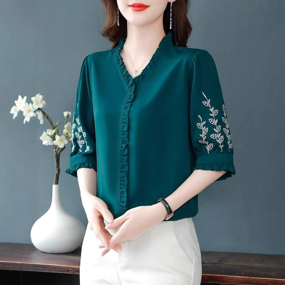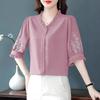 Embroidered Mid-sleeved Shirt Women's Summer Loose-fitting Belly-covering Small Shirt Western Style Chiffon Top Clothes