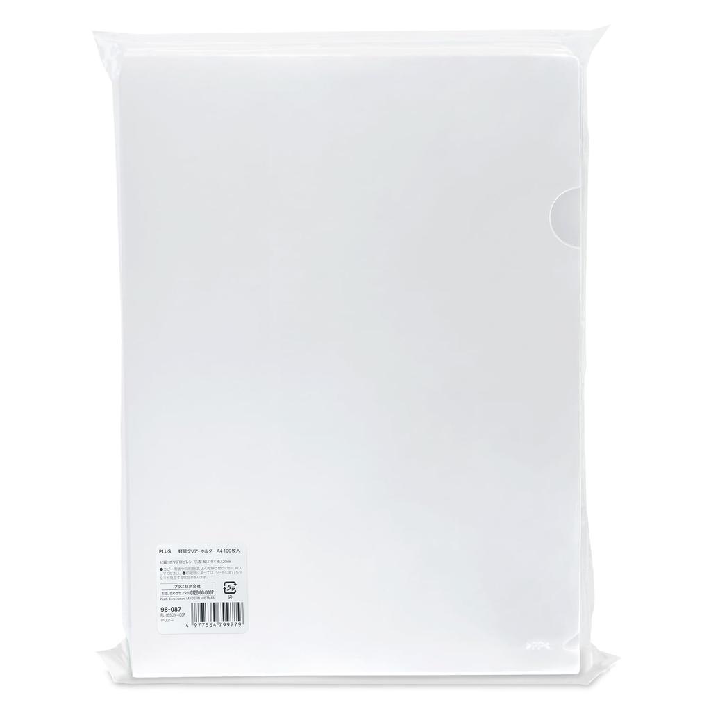 Plus Clear Certified Plastic Lightweight Clear Clear File/Clear Holder, A4, Product, Holder, 100-Pack, FL-165DN-100P 98-087