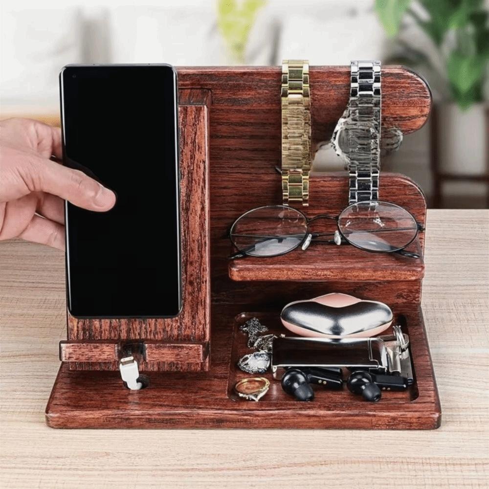 Space Saving Charging Phone Holder Solid Wood Keychain Wallet Storage Rack Desktop Organization