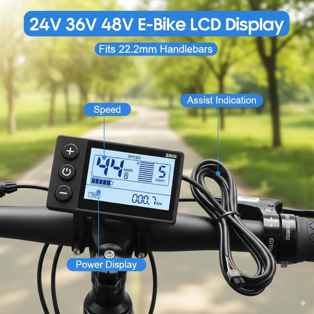 S866 Ebike Display - 24V 36V 48V Waterproof IP65 Scooter Meter with SM Plug, Large Backlit Screen for Ebike/Scooter (Fits 22.2mm/0.9in Handlebar, No.