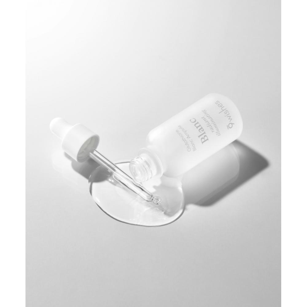 9WISHES Glutathione Blanc Ampoule 30ml is a whitening functional ampoule that focuses on improving blemishes and dark spots in just three days. It offers double brightening care for clear and transparent skin, taking care of traces from within and outside the skin. Containing glutathione to clarify the skin tone, this product has completed clinical tests for the improvement of dark spots and blemishes after three days of use. With a blend of natural ingredients and scientific formulation, it restores the skin's inherent clarity. This ampoule provides triple brightening of skin pigmentation and is designed as a smart solution with noticeable effects after three days of focused use.