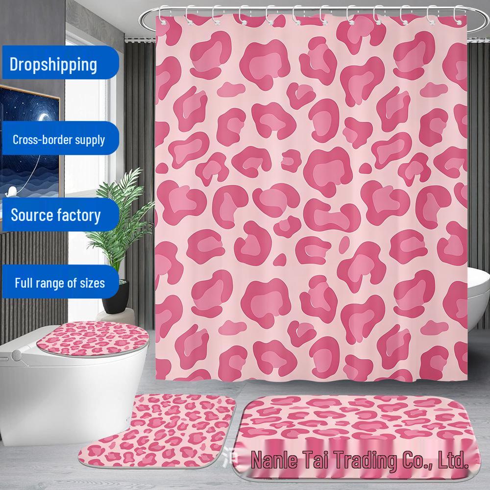 Pink Leopard Shower Curtain Set: Includes Curtain, Non-slip Bath Mat, Toilet Seat Cover, Bathroom Mat, & 12 Hooks.