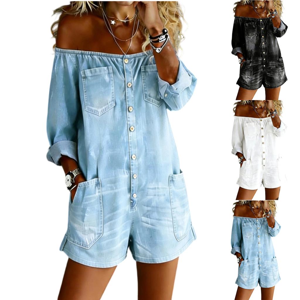 Women's Fashion Retro Off-Shoulder Long-Sleeved Loose Denim Washed Jumpsuit Shorts