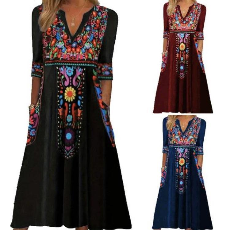 Introducing our Autumn Women's V-neck Pocket Bohemian Print Three-quarter Sleeve dress for Women, the perfect addition to your wardrobe for any occasion. Made of high-quality polyester, this dress offers a relaxed, loose fit and features a comfortable, soft, and lightweight fabric that you won't want to take off.