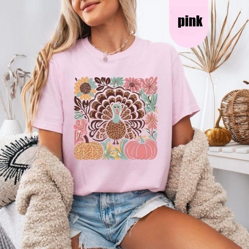 Floral Turkey TShirt Thanksgiving Boho Tee Creative Design Art Aesthetics Shirt Thanksgiving Turkey Tops Women Casual Cotton T