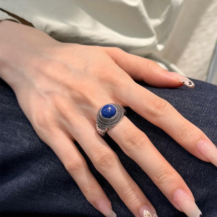 Stylish S925 Sterling Silver Lapis Lazuli Open Ring - Women's Retro, Versatile Punk Design