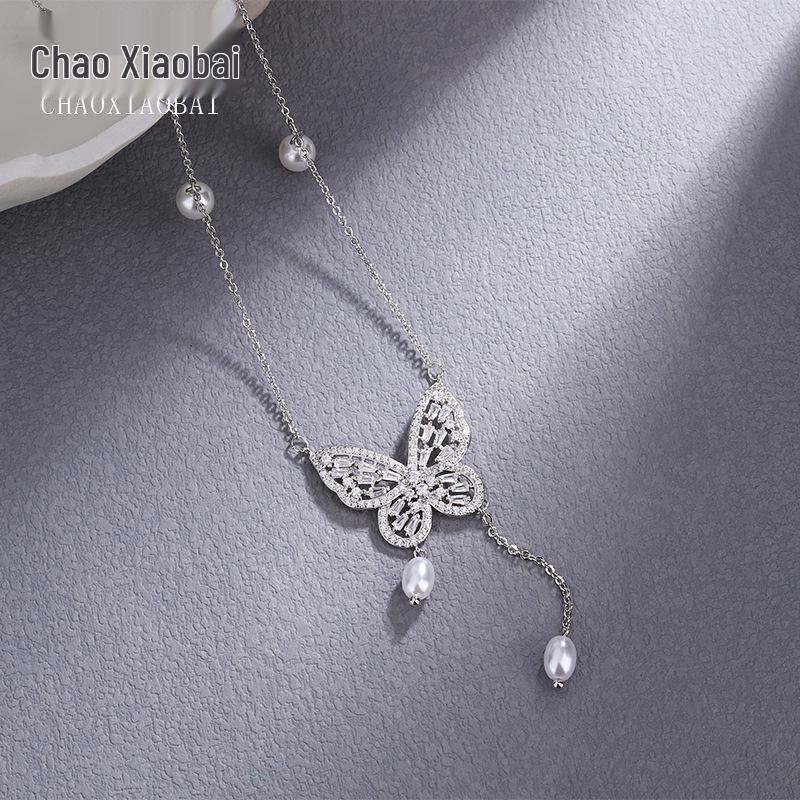 Elegant S925 Silver Butterfly Pearl Necklace with Tassel & Zircon Pendant for Women