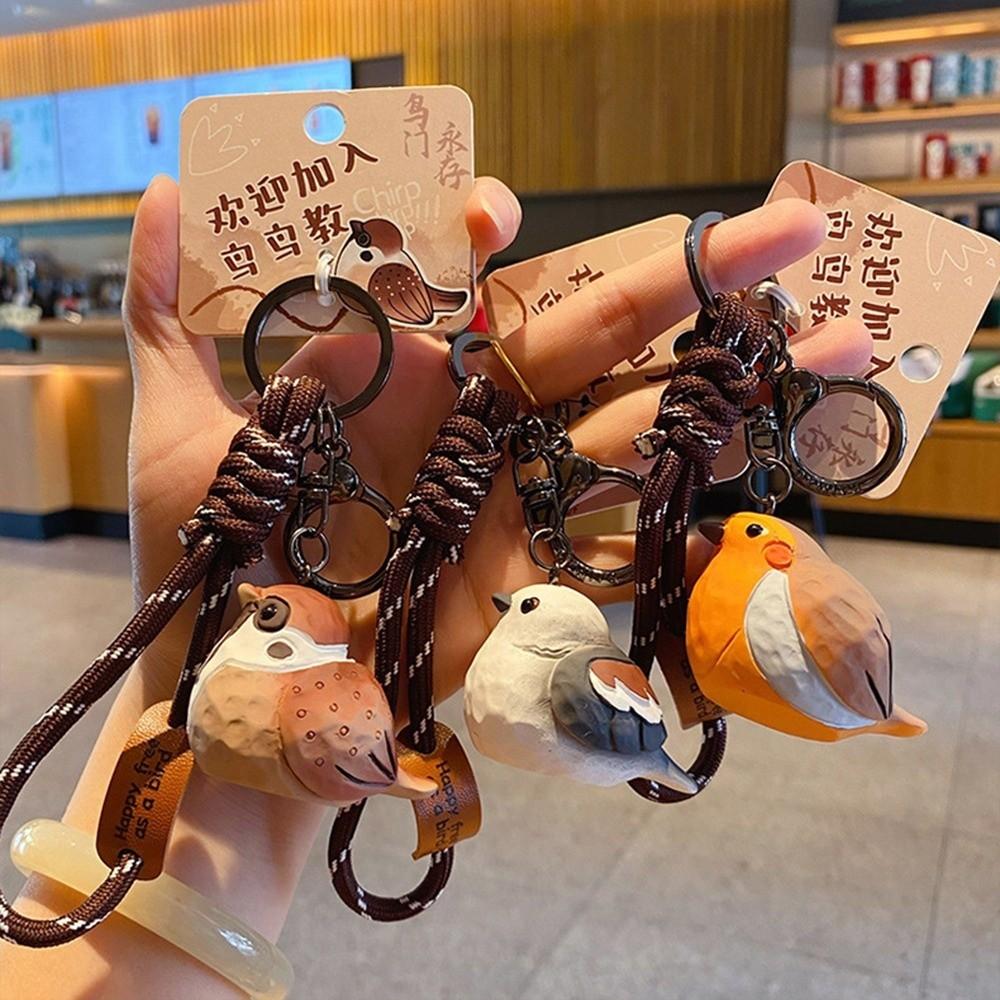 Kawaii Imitation Wood Carving Keychain Grey Blue Tit Pearl Bird Keychain Holiday Gift