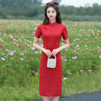 Kırmızı Dantel Cheongsam Kadın Zarif Ince Retro Elbise Standı Yaka 3/4 Kollu Jakarlı Dantel Qipao Çin Tarzı Akşam Gelinlik