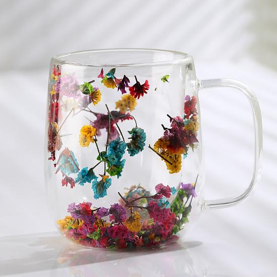 Stylish Double-Layer Dry Flower Aesthetic: This fashionable double-layer glass cup showcases a unique dry flower design sealed between layers, blending practicality with artistic beauty. It serves as both a functional drinkware piece and an eye-catching decorative item suitable for any setting.