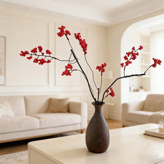 These bright red berries paired with rustic brown branches create a festive atmosphere perfect for Chinese New Year, weddings, housewarmings, and other celebrations symbolizing prosperity and wealth.