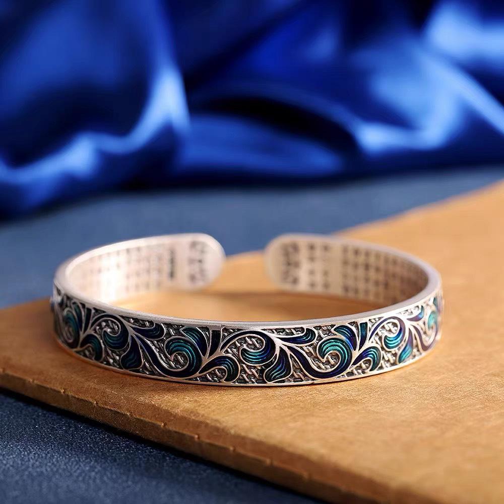 Sterling Silver 9999 Enamel Scroll Heart Sutra Bangle - Ethnic Style Bracelet
