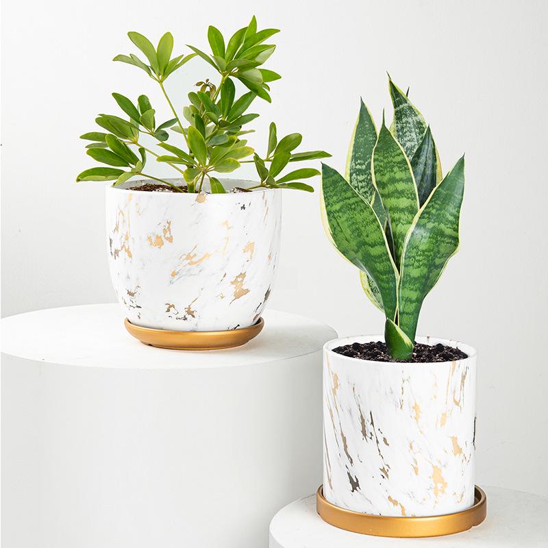Marble Pattern Ceramic Flower Pot with Gold Tray - Nordic INS Style