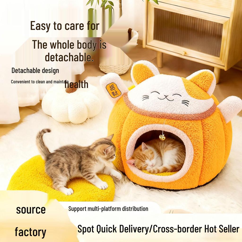 2025 New Plush Half-Closed Warm Winter Cat Nest with Bell