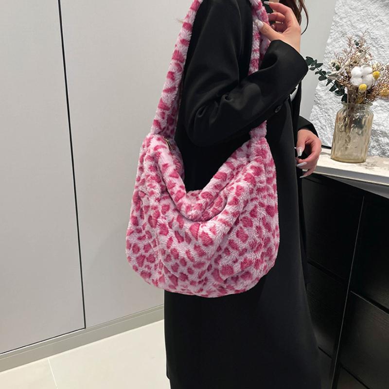 Large Capacity Leopard Women Shoulder Bags Faux Fur Messenger Bag Ladies Plush Hobos Crossbody Vintage Fashi Female Handbags