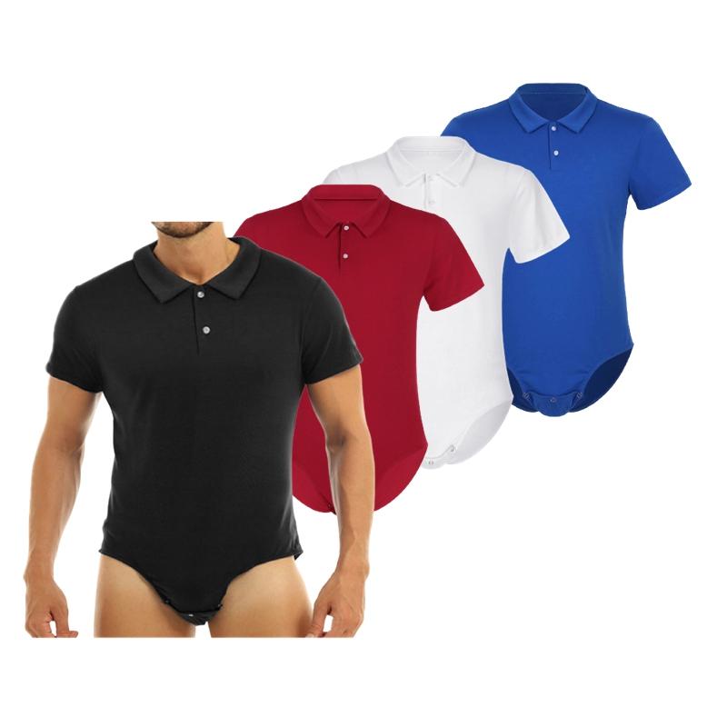 Mens Short Sleeve Turn-Down Collar Shirt One-Piece Leotard Bodysuit Romper Press Button Crotch Pajamas