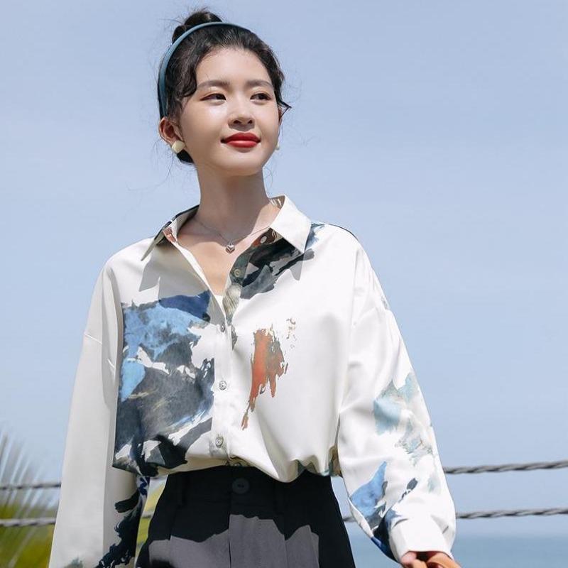 Women's Streetwear Artistic Landscape Print Satin Button Up Shirt