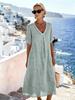 New casual spring and summer loose long dress short-sleeved V-neck solid color cotton and linen dress
