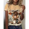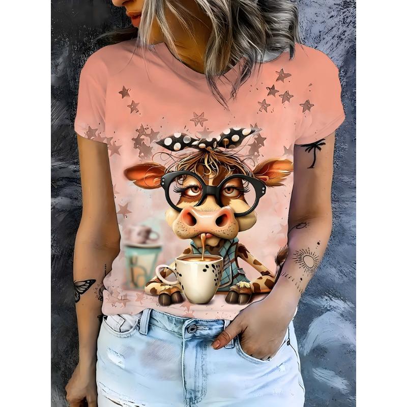 Women's Tee - Cute Coffee Cow & Star Graphic, Playful Cartoon Animal Design for Casual Daily Wear