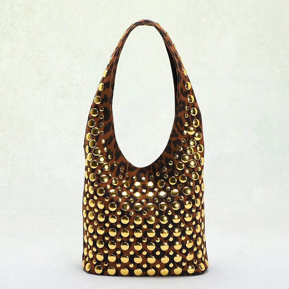 Leopard Rivet Bucket Bags for Women Handbags Luxury Designer Soft Shoulder Bag Punk Studded Shopper Purses Female Clutch Tote