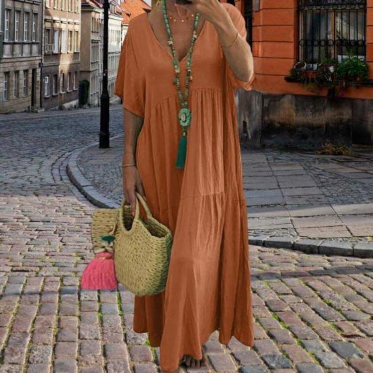 Bu kadın elbisesi, üstün konfor için rahat bol kesim sunan yumuşak ve hafif pamuktan üretilmiştir.. V yakalı tasarım ve uzun etek, zarafeti ve stili sergilemek için mükemmel olan ince ve şık bir siluet yaratır..