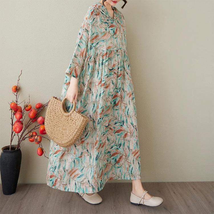 Yaz Vintage Çiçekli Maksi Elbise Büyük Beden Kadın Günlük Bol Kapüşonlular Uzun Pileli Basic Elbise