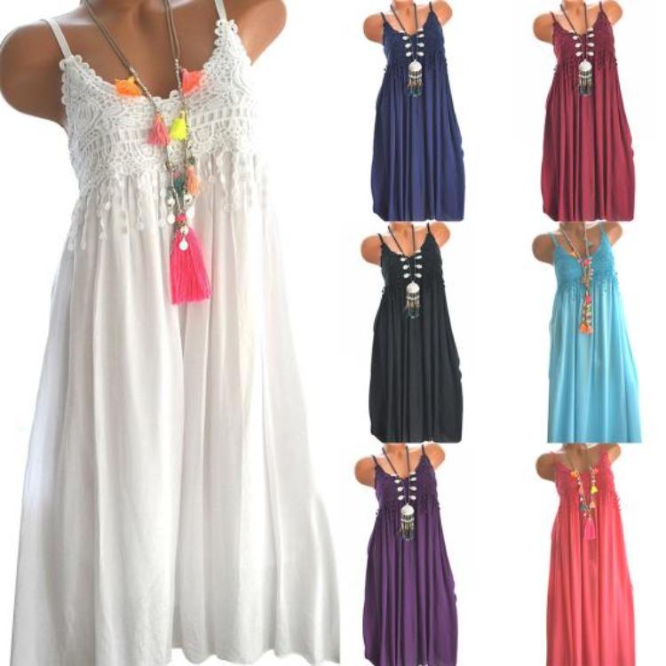 Summer Casual Vintage Maxi Dress Women Solid Color Lace Flower Ruffle Sleeveless