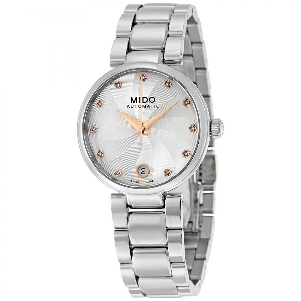 Stainless steel case with a stainless steel bracelet. Fixed stainless steel bezel. Silver dial with rose gold-tone hands and diamond hour markers. Dial Type: Analog. Date display at the 6 o'clock position. Mido caliber 80.611 automatic movement with a 80-hour power reserve. Scratch resistant sapphire crystal. Transparent case back. Case size: 33 mm. Case thickness: 10.5 mm. Round case shape. Fold over clasp. Water resistant at 50 meters / 165 feet. Functions: date, hour, minute, second. Dress watch style. Watch label: Swiss Made. Mido Baroncelli II Automatic Ladies Watch M022.207.11.036.10.