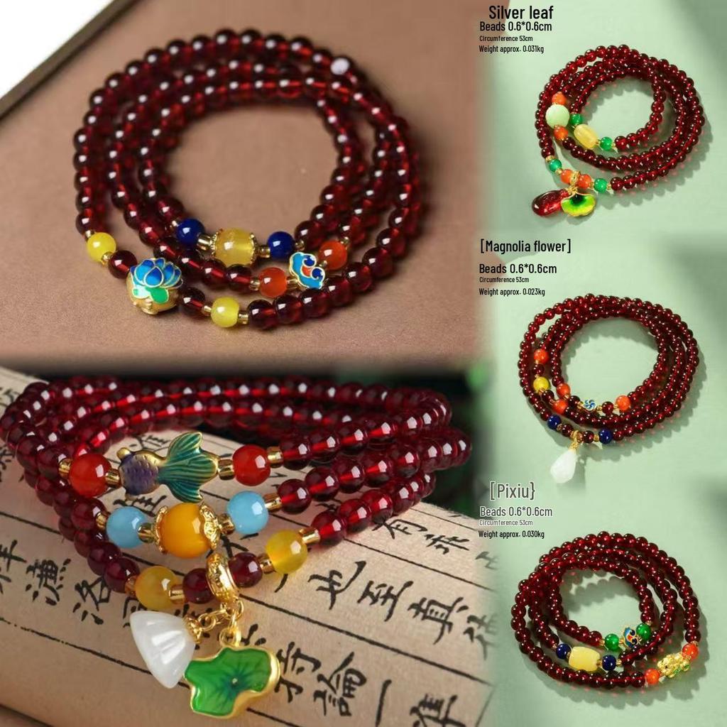 Faux Garnet Multi-Strand Pixiu Ginkgo Magnolia Cloisonné Bracelet - Hot Seller