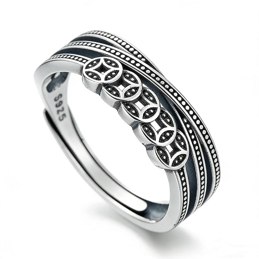 Ethnic Silver S925 Women's Ring: Retro Chinese Style with Wealth-Attracting Five Emperors Coins