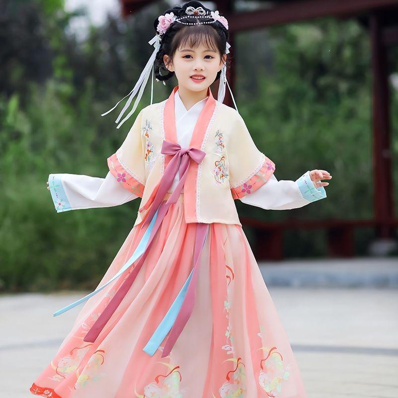 This enchanting hanfu for little girls captures the essence of the Ming Dynasty with its ancient, fairy-tale-inspired design. Crafted from lightweight mesh material, it's perfect for allowing freedom of movement while maintaining an elegant drape. The intricate detailing and delicate patterns evoke a sense of timeless beauty, making it an ideal choice for festive occasions, cultural events, or imaginative play. This elegant suit combines traditional charm with comfort, making every little girl feel like a fairy princess from ancient times.