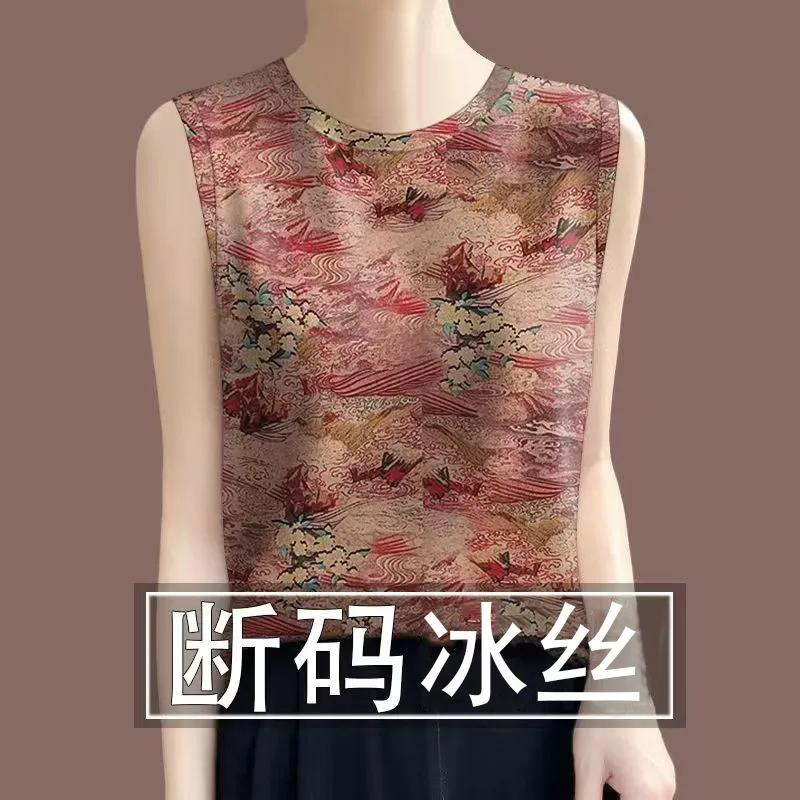 Women's Oriental Landscape Print Sleeveless Ice Silk Top Casual Round Neck Tank Top