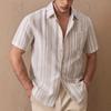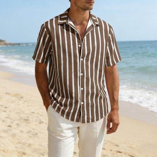 This men's short sleeve shirt is crafted from a premium linen blend, offering a lightweight, breathable, and natural feel for all-day comfort. Featuring a stylish turndown collar and a vertical stripe pattern, it flatters your figure while providing a casual yet polished look.
