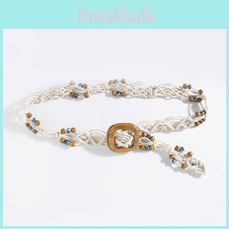 This bohemian woven waist belt features a hand-stitched design crafted from breathable cotton-linen fabric, It showcases a natural wood square buckle for secure tying and features intricate patchwork details. Suitable for casual or vacation wear, it adds a vintage ethnic touch to any outfit. Wipe clean with a damp cloth to maintain its appearance.