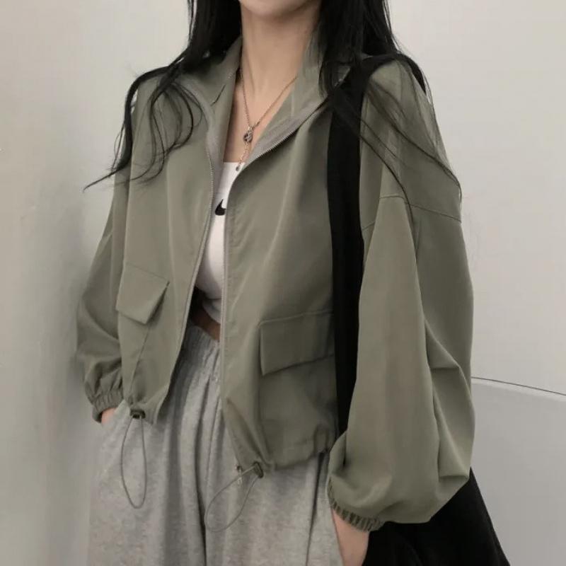 Vintage workwear drawstring short baseball jacket coat for women with a high-end, niche outerwear design
