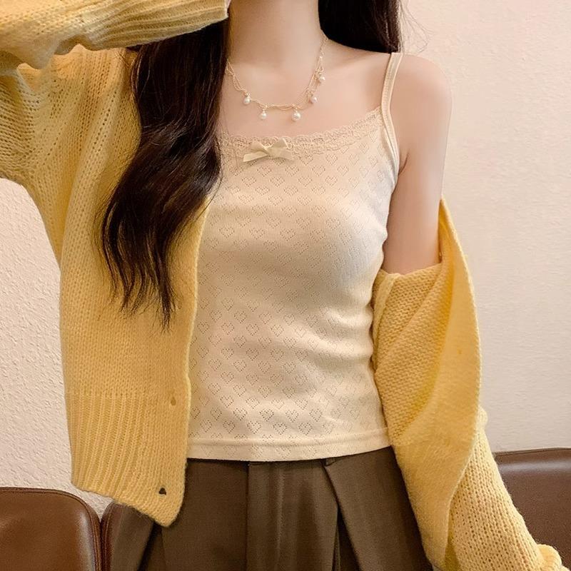 Lace Patchwork Base Camisole Women's Spring New Suit with Bow Underneath Sexy Slim Top