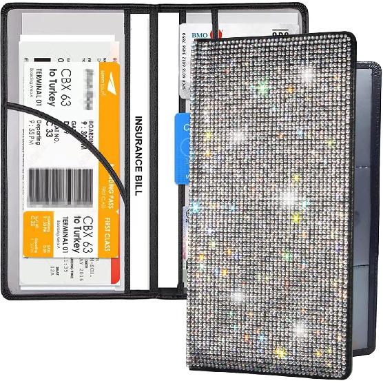 Bling Rhinestone Artificial Diamond Car Registration and Insurance Document Holder, Glitter Car Essentials Glove Box Organizer Compartment Bling