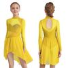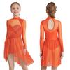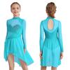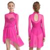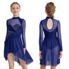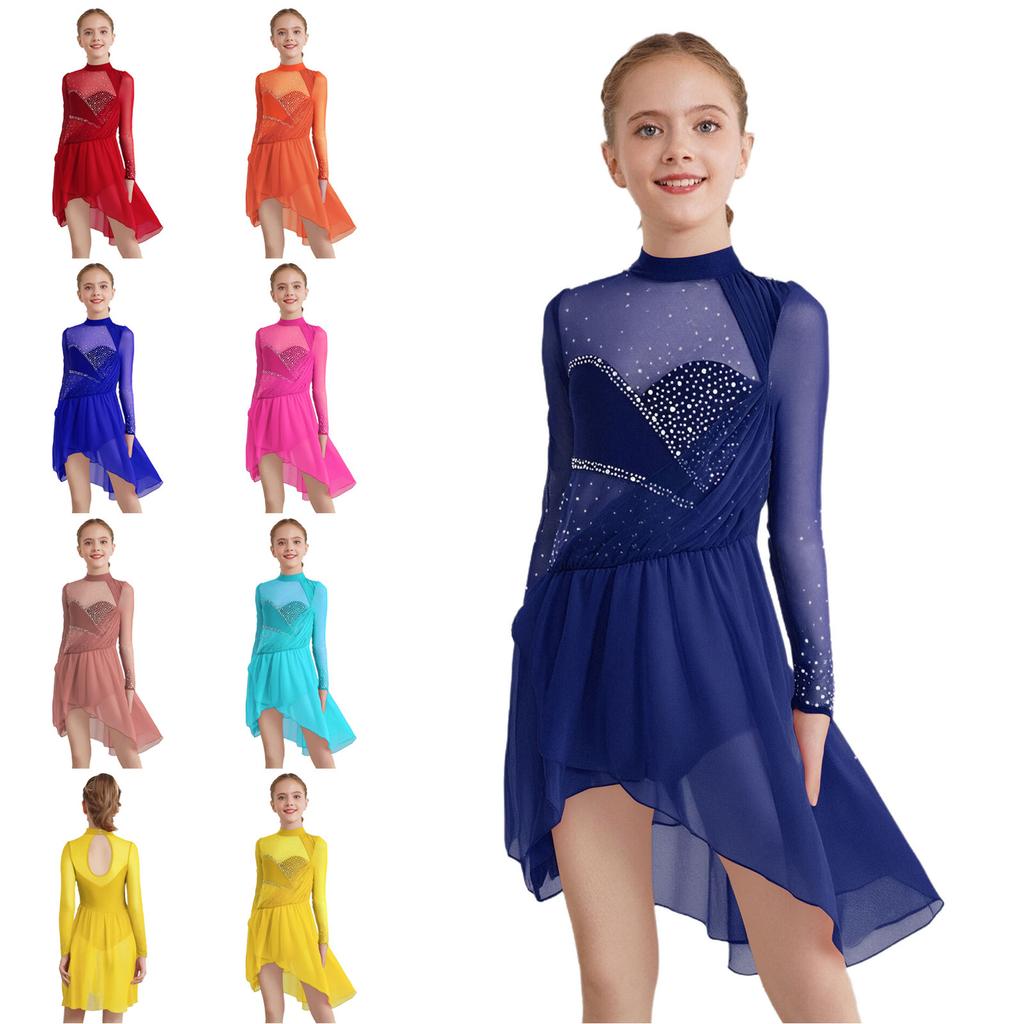 Girls Figure Skating Dance Dress: Sheer Mesh Patchwork Long Sleeves Mock Neck Keyhole Back Rhinestones Irregular Hem with Built-in Briefs