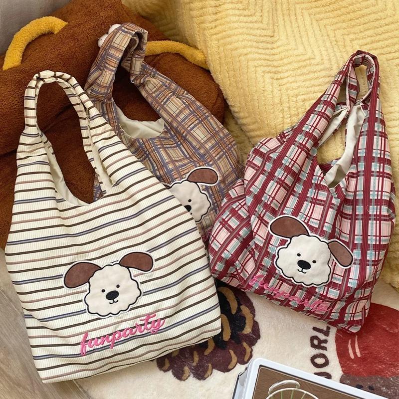 Carto Dog Plaid Stripe Women Shoulder Bags Corduroy Large Capacity College Girls Underarm Tote Bag Casual Female Vest Handbags
