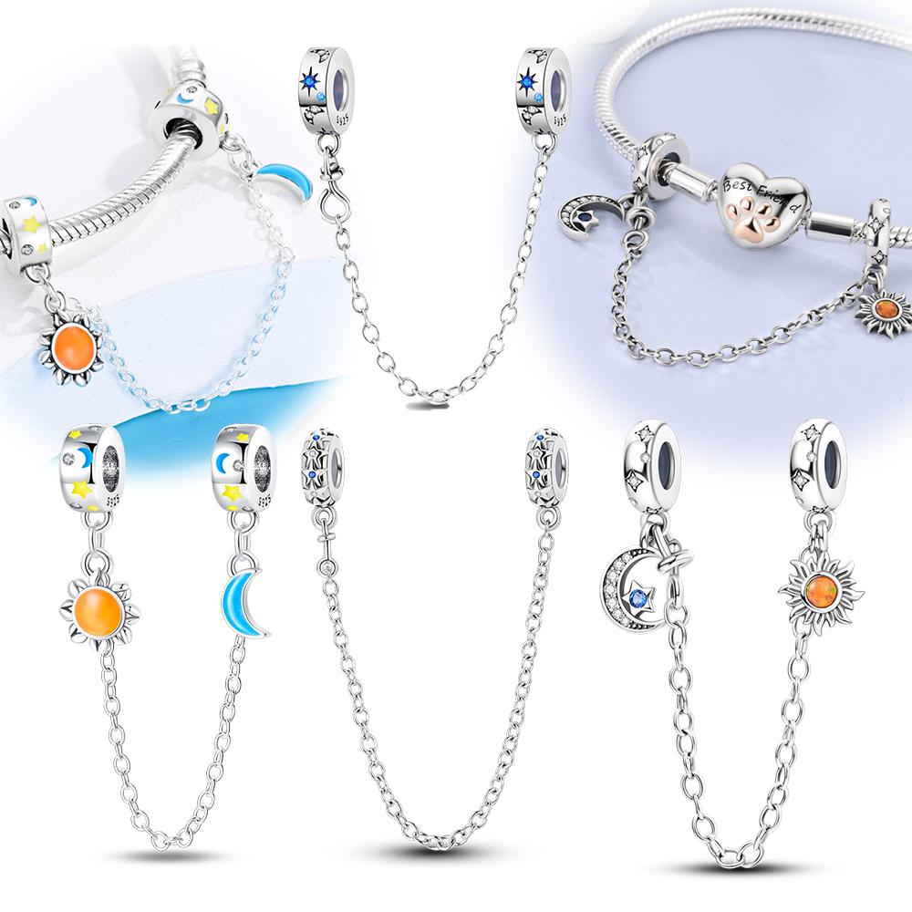 Plated 925 Silver Sun Moon Star Openwork Safety Chain Charms Fit 925 Charms Bracelet Beads Jewelry Gifts for Women