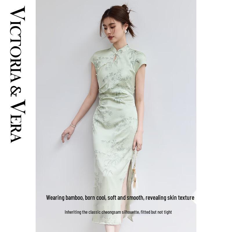 VICTORIA&VERA Summer New Chinese Style Emerald Green Bamboo Print Side Slit Cheongsam Dress