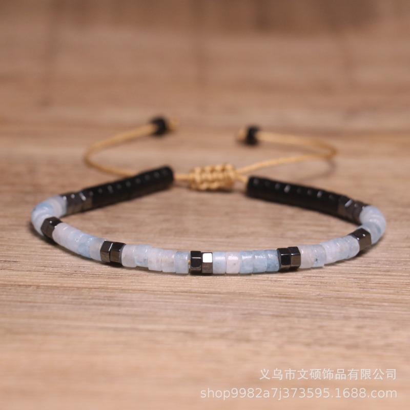 Aquamarine Hematite Square Bead Bracelet – Silver Accent Adjustable Boho Jewelry, Calm Clarity Gift for Men & Women