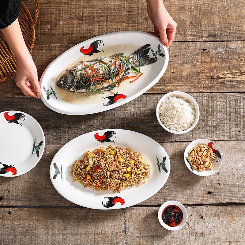 Ceramic Retro Rooster Oval Fish Serving Plate for Microwave & Hotel Use
