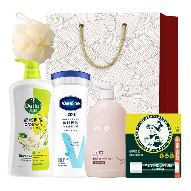 This Dettol gift set features a refreshing shower gel, complemented by body lotion, laundry detergent, and a lip balm, all presented in a convenient gift bag. Ideal for daily personal care and suitable for various skin types.
