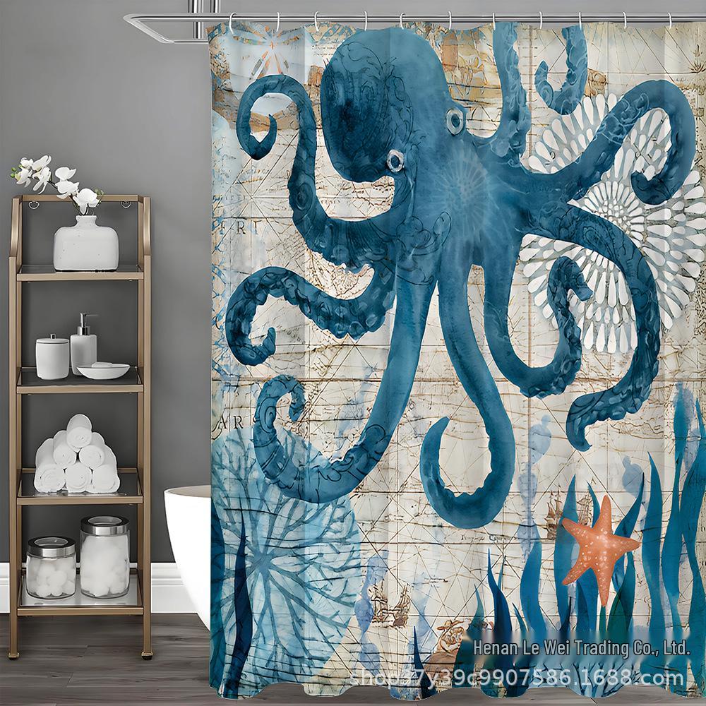 Cyan Giant Octopus Shower Curtain Set – Moisture & Mildew-Proof, No-Punch Installation, 4 Pieces